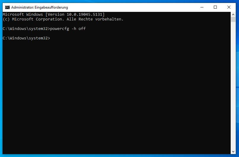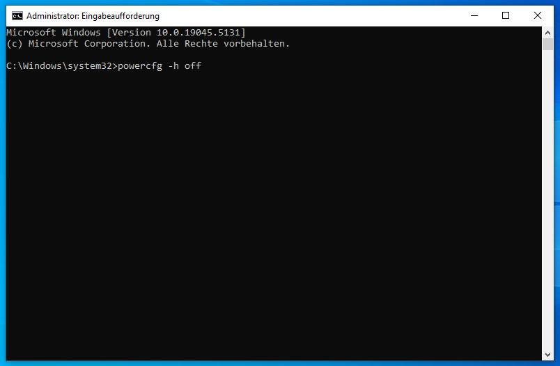 geben Sie powercfg -h off ein und drücken die Eingabetaste. (h steht für hibernate = überwintern)