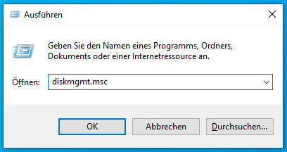 Bei "Ausführen" geben Sie bei "Öffnen:" diskmgmt.msc ein und klicken auf "OK".