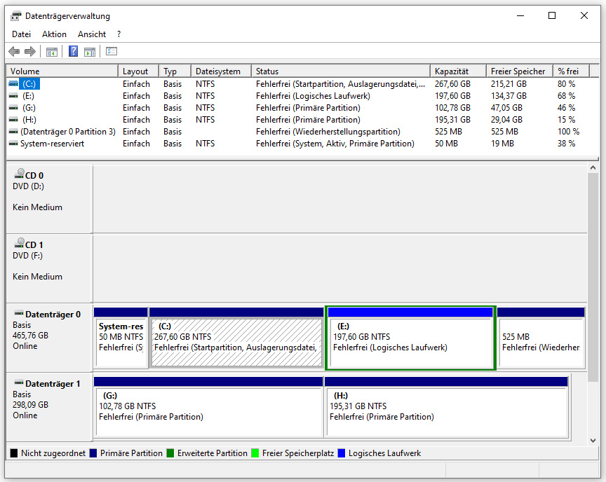 Partition (C:) und (E:) sind auf dem Datenträger 0. Auf (C:) ist Windows 10 (Windows 7 ist auch möglich).