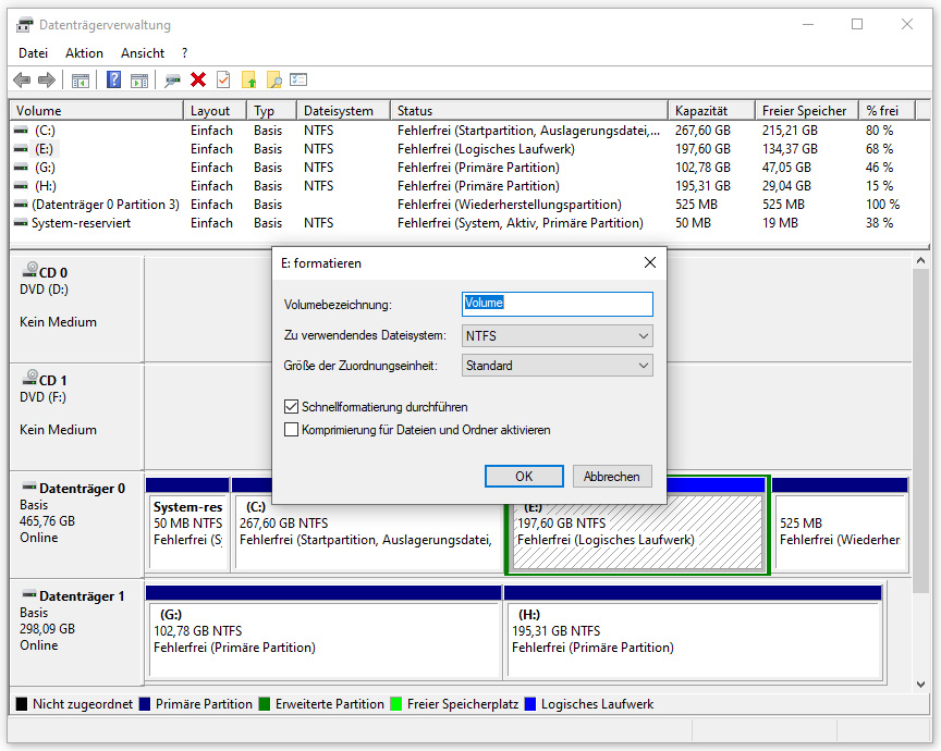 öffnet sich die Datenträgerverwaltung und zeigt die vorhandenen